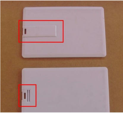 1、我們首先在卡片式U盤上找到一個凸起或者有縫隙的地方,我們朝外按或扣,卡片式U盤便會彈出USB接口。