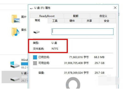 6、再次回到U盤屬性窗口中,就可以發(fā)現(xiàn)U盤的文件系統(tǒng)已經(jīng)成功轉(zhuǎn)換成NTFS格式了。