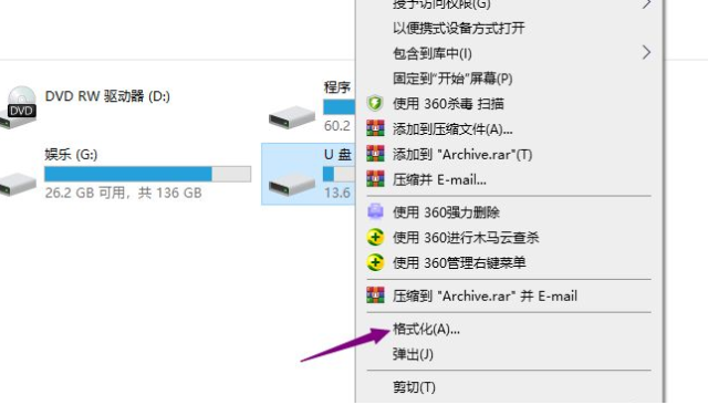 插入U(xiǎn)盤到電腦上,選擇格式化U盤。