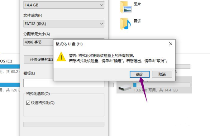 5、在彈出的警告框中點(diǎn)擊確定進(jìn)行格式化操作,即可解除閃迪u盤寫保護(hù)的問題。