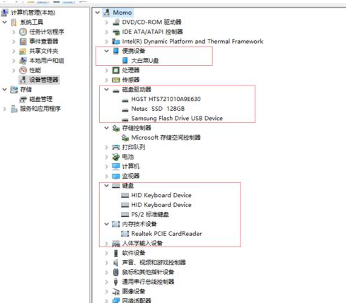 3、打開設備管理器,依次點擊右側的驅動器、控制器、設備,查找是否有我們的U盤,需要注意的是,我們需要好好找找便攜設備,鍵盤等,看看是否被識別成其他的設備了。
