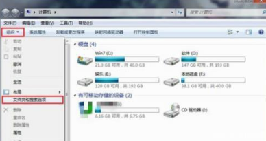 2,雙擊打開計(jì)算機(jī),單擊彈出窗口中的“組織 - 文件夾和搜索選項(xiàng)”。