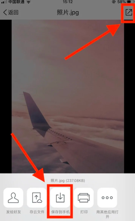 7、打開照片后,點擊右上角的【分享】,彈出列表點擊【保存到手機】即可。
