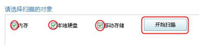 2、選擇需要掃描的對(duì)象,一般會(huì)有本地硬盤、內(nèi)存、移動(dòng)存儲(chǔ)設(shè)備三項(xiàng),小編是建議大家全都給選上,然后點(diǎn)擊“開始掃描”。