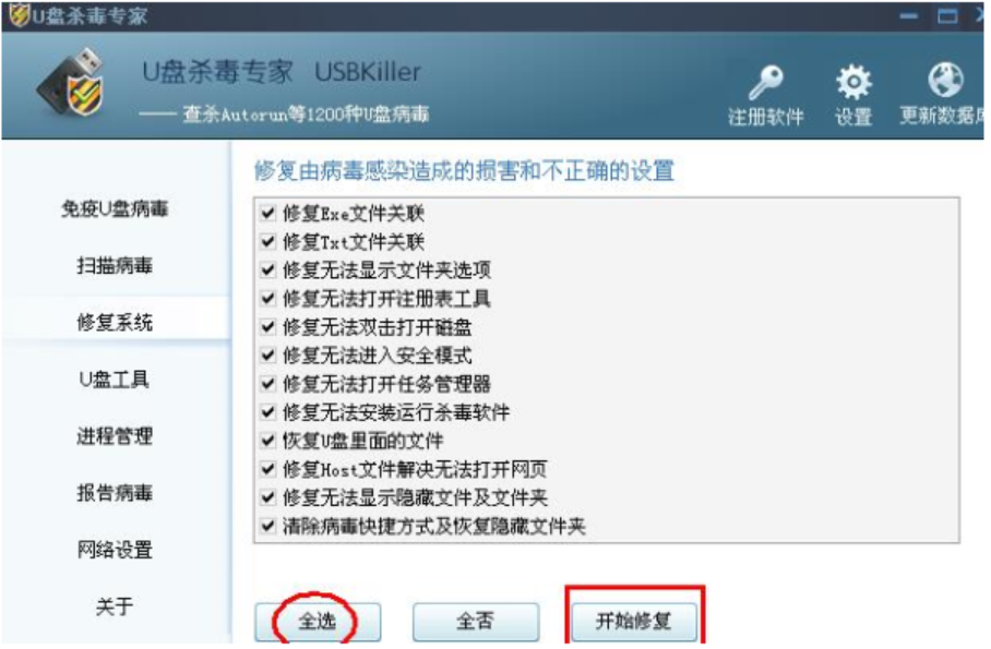 3、在主界面左側(cè)單擊修復(fù)系統(tǒng),選擇“全選”,點(diǎn)擊“開始修復(fù)”就可以使文件或數(shù)據(jù)恢復(fù)到原有的設(shè)置了,幫助修復(fù)一些“無法顯示隱藏文件或文件夾”、“雙擊不能打開磁盤”和“U盤無法運(yùn)行殺毒軟件”等情況。