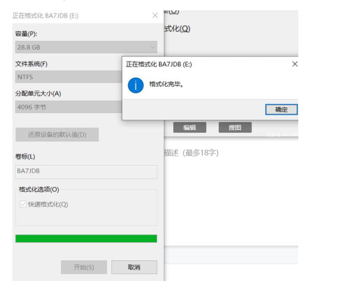 3、打開格式化BA7JDB(E:)對話框 ,在格式化選項下的快速格式化(Q)前打上勾。點擊確定,等待格式化U盤。