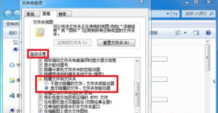 4、 點(diǎn)擊高級設(shè)置,選擇顯示隱藏的文件、文件夾和驅(qū)動(dòng)器,再查看電腦是否能讀出U盤。