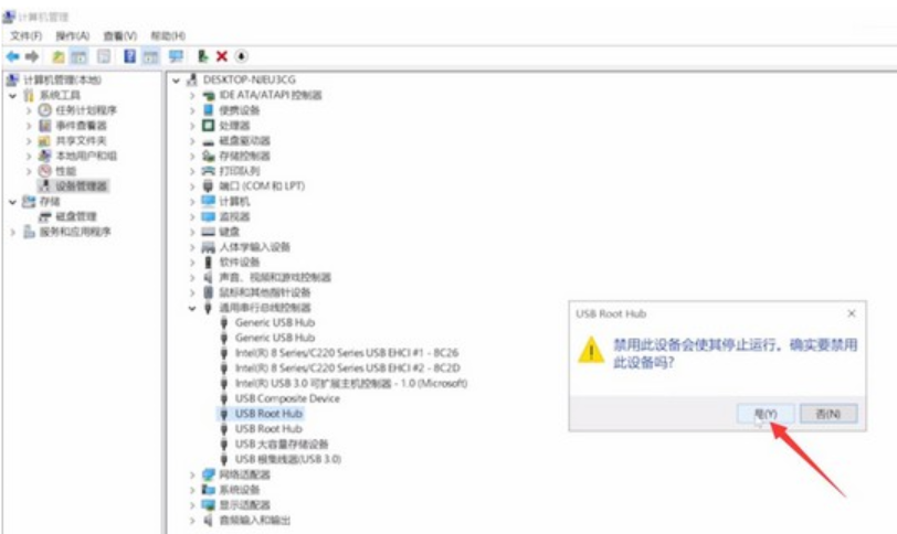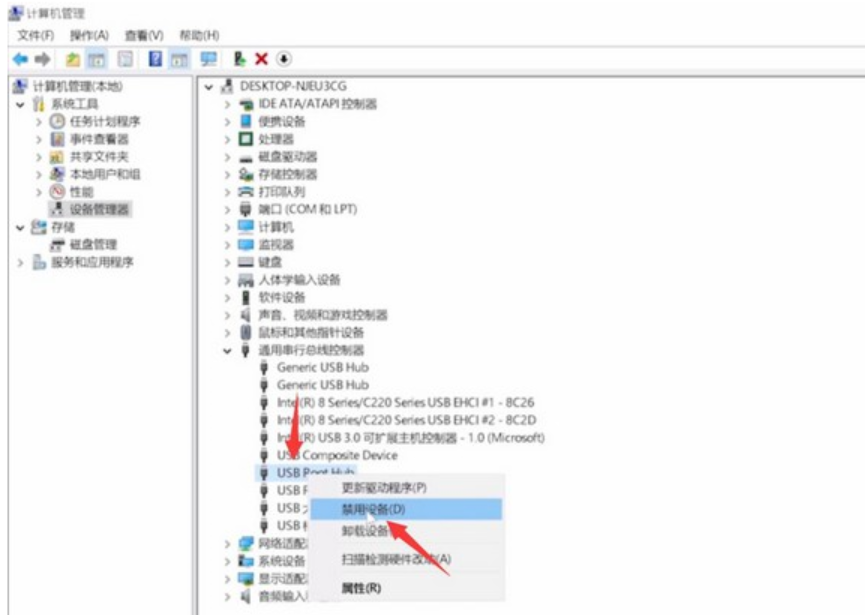 3、 展開該選項(xiàng),鼠標(biāo)右鍵任意一個(gè)USB Root Hub,選擇禁用設(shè)備。