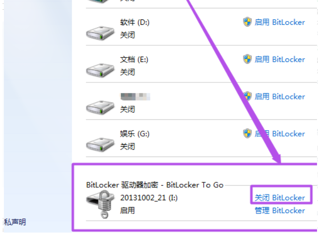 4、在其中找到用BitLocker加密了的U盤的盤符,點擊‘關(guān)閉BitLocker’。