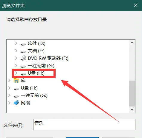 5、選擇U盤,點(diǎn)擊確定,然后就可以下載音樂到U盤里了。