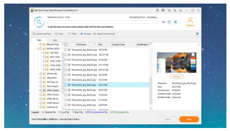 用戶可以將掃描限制為特定的文件類型,MiniTool Power能夠從用戶甚至無法看到的分區(qū)中獲取文件,并且支持包括光學(xué)介質(zhì)在內(nèi)的可移動(dòng)驅(qū)動(dòng)器。掃描速度非???,搜索結(jié)果可以更容易地找到正在尋找的內(nèi)容。