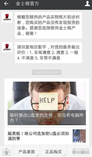 4、關(guān)注成功,會(huì)接收到金士頓官方消息,根據(jù)提示,輸入“驗(yàn)真?zhèn)巍?