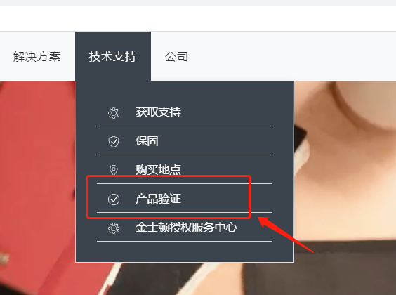 2、接著點(diǎn)擊技術(shù)支持,在下拉菜單中點(diǎn)擊產(chǎn)品驗(yàn)證;