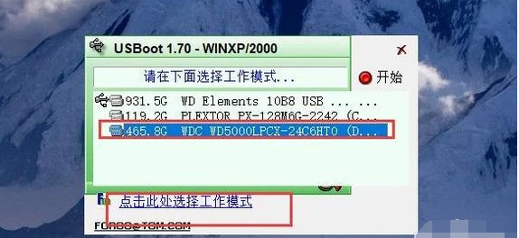 3、打開軟件后,選中需要修復(fù)的U盤設(shè)備,點擊“選擇工作中模式”選項。