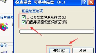 4、勾選【自動(dòng)修復(fù)文件系統(tǒng)錯(cuò)誤】和【掃描并嘗試修復(fù)壞扇區(qū)】,點(diǎn)擊【開(kāi)始】即可。