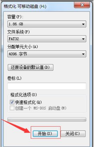 3.在彈出一個格式化窗口,可移動磁盤的相關(guān)的內(nèi)容,點擊“開始”將會進行對u盤進行格式。