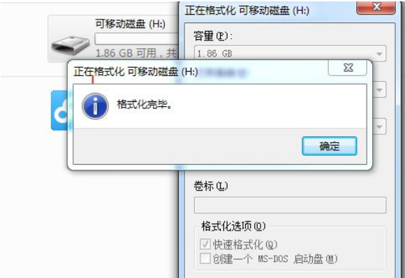 5.格式速度跟u盤的大小是有差異的,U盤格式化完成之后,將會彈出一個“格式化完畢”的確認框的信息。點擊確定退出。