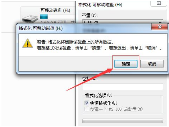 4.此時將會彈出窗口確定是否真的需要格式化u盤操作,點擊”確定“。