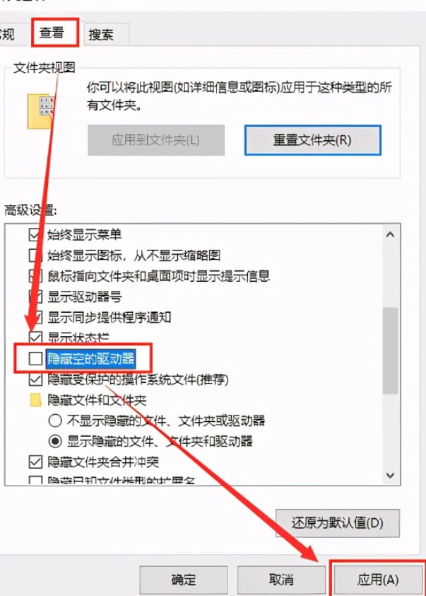 2.在文件夾選項(xiàng)界面,我們點(diǎn)擊「查看」,把隱藏空的驅(qū)動(dòng)器這一項(xiàng)取消勾選,然后點(diǎn)擊「應(yīng)用」,這樣就能顯示出隱藏的u盤盤符。