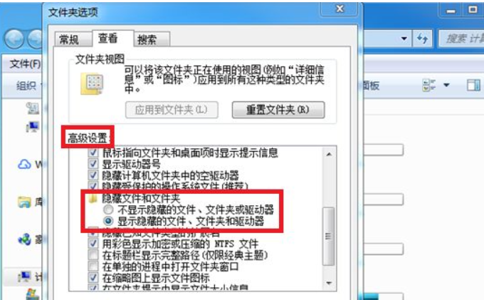 7、在【高級設(shè)置】選擇【顯示隱藏的文件、文件夾和驅(qū)動器】即可。