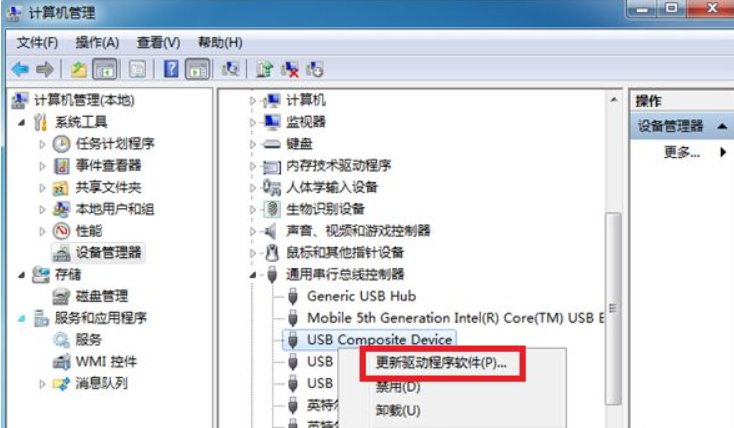 1、進入計算機管理界面,點擊設(shè)備管理器,更新其中的驅(qū)動程序;