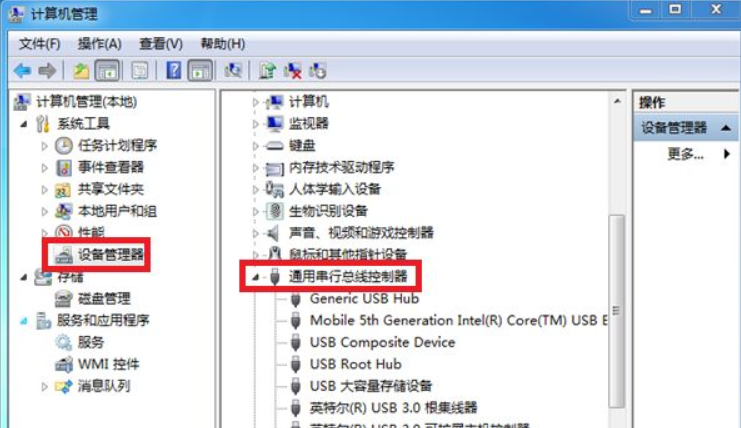 2、點擊【設(shè)備管理器】,然后在右邊點擊【通用串行總線控制器】,如果出現(xiàn)黃色感嘆號就是驅(qū)動沒有安裝成功。