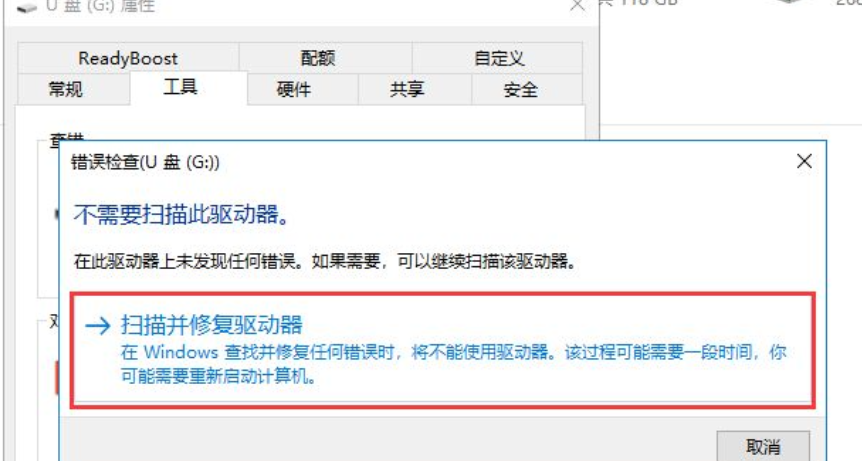 7、在彈出的對(duì)話框中點(diǎn)擊掃描并修復(fù)驅(qū)動(dòng)器,待掃描修復(fù)進(jìn)行后就可以處理由邏輯性壞道造成的U盤(pán)寫(xiě)保護(hù)。