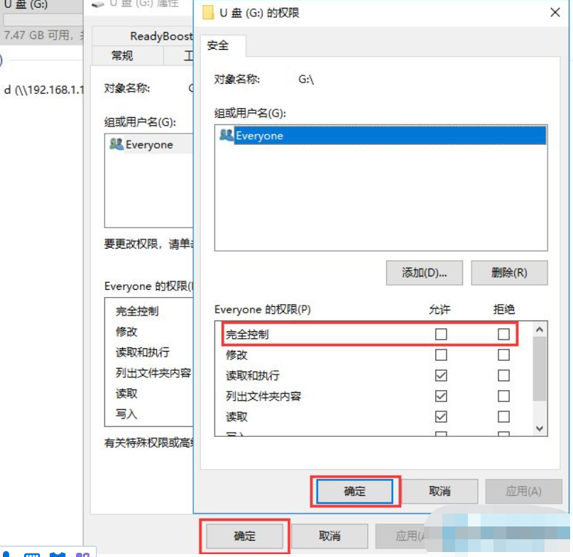 4、在開(kāi)啟的窗口上端選中everyone,隨后在下邊everyone的管理權(quán)限中啟用徹底控制,最終先后點(diǎn)擊確定就可以。