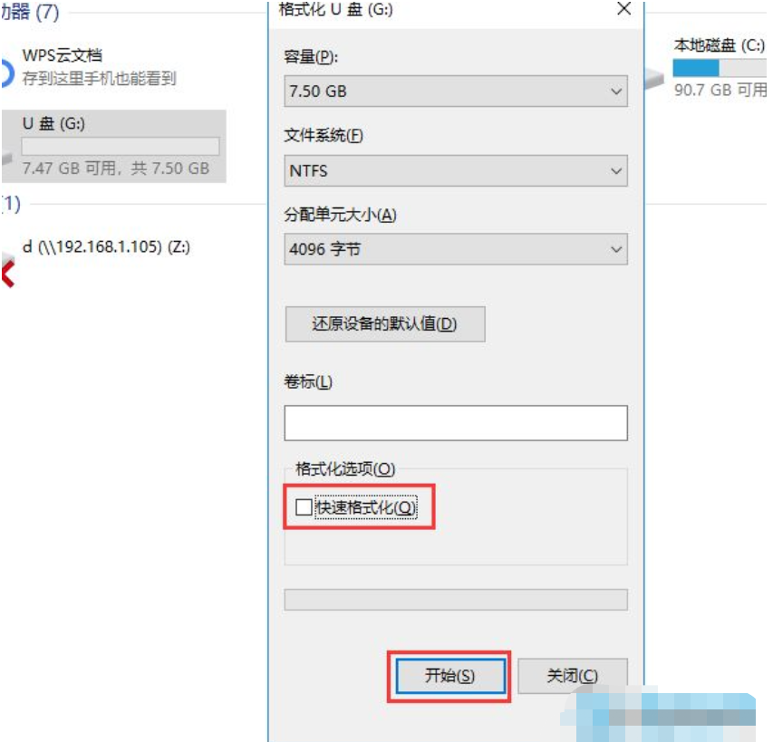 9、在彈出的窗口中取消啟用迅速格式化,隨后點(diǎn)擊開(kāi)始就可以,待格式化進(jìn)行就可以。
