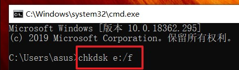 例如U盤在電腦上盤符為E,則鍵入“chkdsk e:/f”,然后按“Enter”鍵按鈕,進入磁盤自檢和修復(fù)。