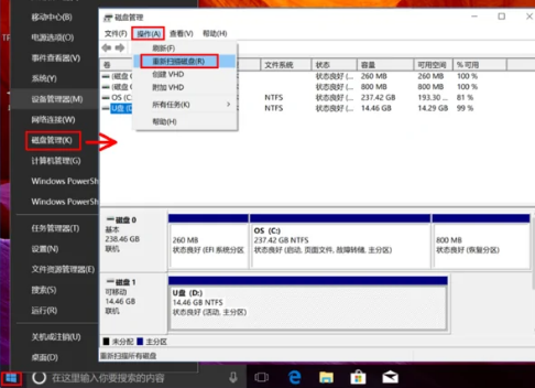 2. 右擊開始菜單選擇【磁盤管理】,逐一選中各個磁盤,點擊【操作】,選擇【重新掃描磁盤】,如果這樣還不行的話,就是電腦的問題了。