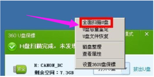 2、點擊下拉箭頭,會彈出一個菜單,點擊掃描U盤,360殺毒即可開始自動啟動并開始對U盤全面掃描;