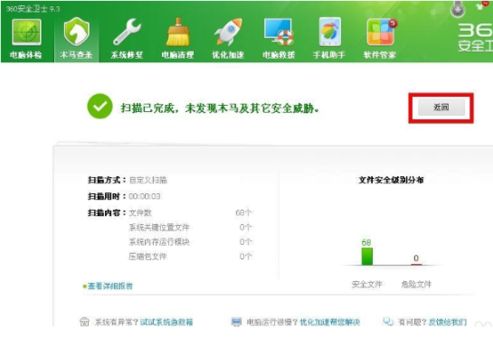 4、耐心等待掃描介紹,如果有病毒的話會出現(xiàn)清楚病毒,如果沒有的話會告知U盤是安全的并出現(xiàn)返回選項。