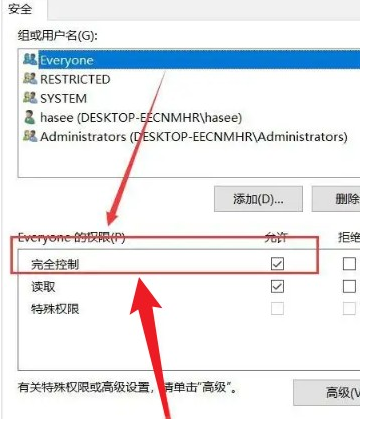 3、在everyone的權(quán)限界面下,設(shè)置允許“完全控制”。