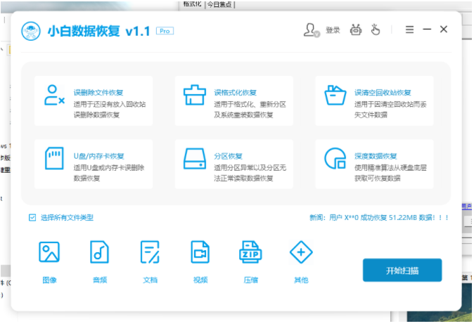 小白數(shù)據(jù)恢復這是一款操作比較簡單、功能比較強大的數(shù)據(jù)恢復軟件,小白數(shù)據(jù)恢復軟件提供提供誤刪文件恢復,硬盤數(shù)據(jù)恢復,U盤數(shù)據(jù)恢復等等服務,支持快速掃描恢復文件數(shù)據(jù),并覆蓋多種恢復場景,可輕松恢復多種數(shù)據(jù),可以完全恢復丟失的文件、圖片、文檔、視頻、刪除、格式化、分區(qū)丟失、操作系統(tǒng)崩潰、病毒攻擊以及其他數(shù)據(jù)丟失情況。