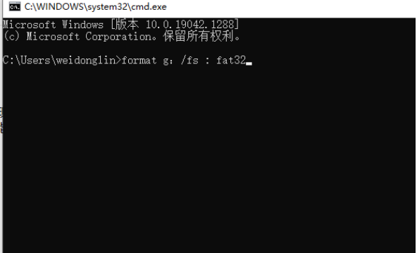 3、在命令提示符窗口中輸入“format g:/fs : fat32”并且回車運(yùn)行此運(yùn)算即可。