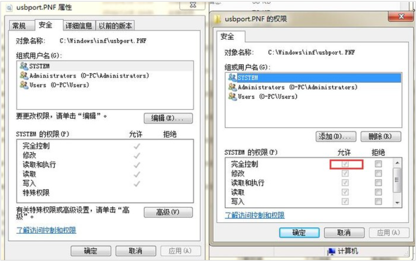 4、鼠標(biāo)右鍵點(diǎn)擊usbstor.pnf文件,在彈出菜單中選擇【屬性】,切換到【安全】標(biāo)簽頁(yè),在【組或用戶名】框中選中當(dāng)前用戶名,接著點(diǎn)擊編輯,把用戶權(quán)限【完全控制】的勾去掉,點(diǎn)擊確定即可;