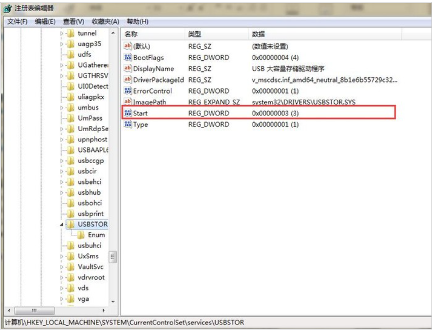 5、點(diǎn)擊【開始--運(yùn)行】,輸入regedit,打開注冊(cè)表編輯器。依次展開【HKEY_LOCAL_MACHINE\SYSTEM\CurrentControlSet \Services\USBSTOR】,找到【Start】鍵,雙擊打開,其值若為4,修改為3,點(diǎn)擊確定按鈕后,重新啟動(dòng)電腦即可。
