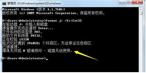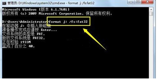 2、輸入“format j: /fs:fat32”(其中j表示U盤所在盤符)并按回車鍵執(zhí)行U盤格式化操作。