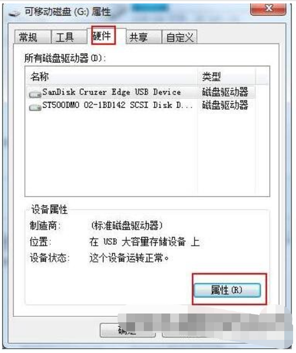 2、然后切換至硬件選項,點擊底部的屬性