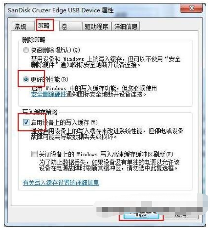 3、打開后選擇策略,勾選更好的性能以及啟用設備上的寫入緩存,確定即可