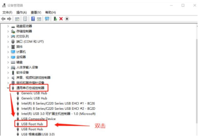 3.然后在設(shè)備管理器中,找到“通用串行總線控制器”并展開(kāi),找到“USB Root Hub”并點(diǎn)擊。