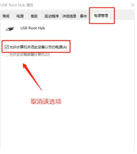 4.在USB Root Hub屬性窗口中,切換至“電源管理”選項(xiàng)卡,取消“允許計(jì)算機(jī)關(guān)閉此設(shè)備以節(jié)約電源(A)”的勾選,最后點(diǎn)擊“確定”就可修復(fù)U盤(pán)插入電腦后識(shí)別不出的問(wèn)題。