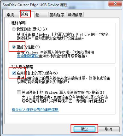 3、點擊“策略”,選擇“更好的性能”,并勾選“啟用設備上的寫入緩存”。