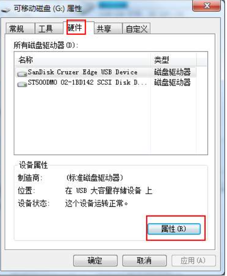 1、首先打開U盤屬性,進入硬件窗口屬性;