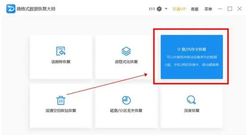 1、下載并運(yùn)行【嗨格式數(shù)據(jù)恢復(fù)大師】數(shù)據(jù)恢復(fù)軟件,點(diǎn)擊“U盤/內(nèi)存卡恢復(fù)”;