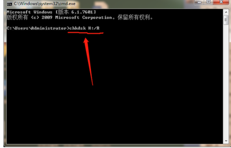 2、在命令提示符窗口中輸入命令chkdsk H:/R回車。注意:H代表的是U盤盤符