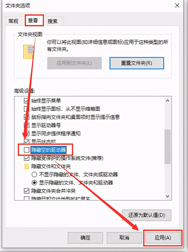 2、在文件夾選項(xiàng)界面中,切換至查看,將隱藏空的驅(qū)動(dòng)器取消勾選,最后點(diǎn)擊應(yīng)用。