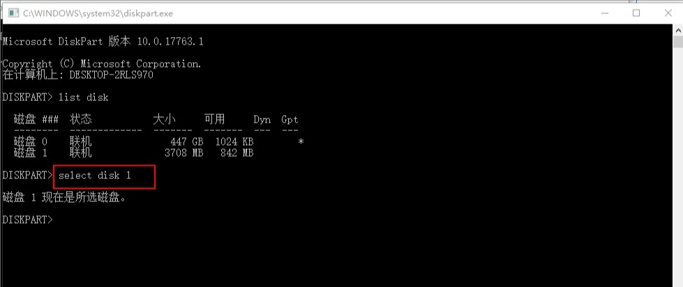 4.在輸入select disk 1,然后按回車,注意:disk和1之間必須要有一個(gè)空格格開,不明白的話大家可以直接復(fù)制這個(gè)命令運(yùn)行即可。