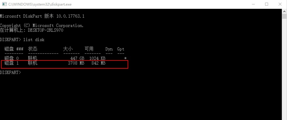 3.再輸入list disk,再按回車,此時(shí)即可看到這臺電腦的所有磁盤大致情況,u盤通常是磁盤1。